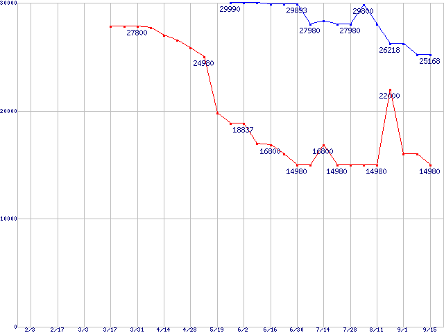 メモリ主要製品(最安値5千円~1万円未満)の最安値推移