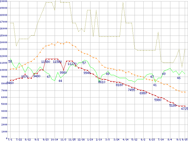 ※このグラフは過去のデータも税率5%相当に調整した税込み相当額のグラフです。 税率変更や、総額表示方式導入(2004年4月)の影響は除いています。 | | | ●凡例 | 最安値 (点線部は販売店未確認 または未調査) | 平均値 | 最高値 | ショップ数 |