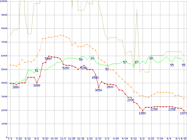 ※このグラフは過去のデータも税率5%相当に調整した税込み相当額のグラフです。 税率変更や、総額表示方式導入(2004年4月)の影響は除いています。 | | | ●凡例 | 最安値 (点線部は販売店未確認 または未調査) | 平均値 | 最高値 | ショップ数 |