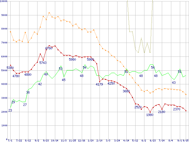※このグラフは過去のデータも税率5%相当に調整した税込み相当額のグラフです。 税率変更や、総額表示方式導入(2004年4月)の影響は除いています。 | | | ●凡例 | 最安値 (点線部は販売店未確認 または未調査) | 平均値 | 最高値 | ショップ数 |