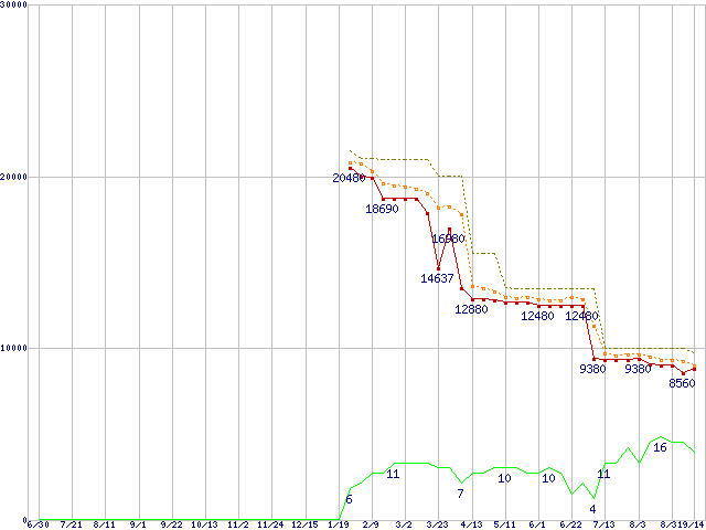 ※このグラフは過去のデータも税率5%相当に調整した税込み相当額のグラフです。 税率変更や、総額表示方式導入(2004年4月)の影響は除いています。 | | | ●凡例 | 最安値 (点線部は販売店未確認 または未調査) | 平均値 | 最高値 | ショップ数 |
