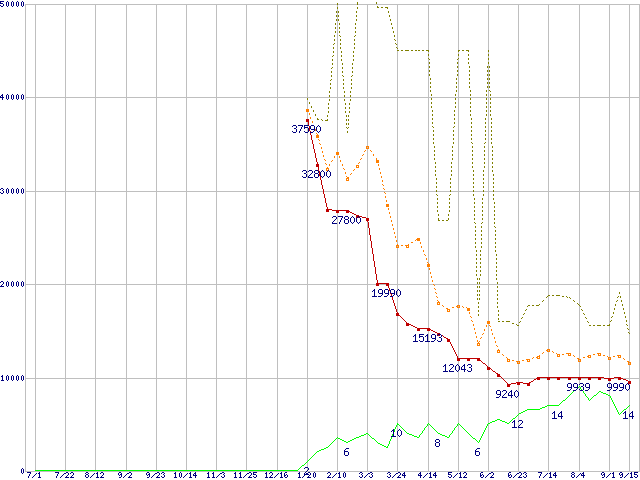※このグラフは過去のデータも税率5%相当に調整した税込み相当額のグラフです。 税率変更や、総額表示方式導入(2004年4月)の影響は除いています。 | | | ●凡例 | 最安値 (点線部は販売店未確認 または未調査) | 平均値 | 最高値 | ショップ数 |