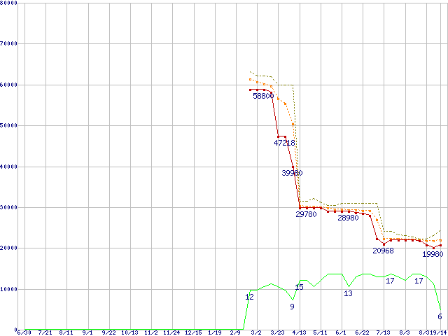※このグラフは過去のデータも税率5%相当に調整した税込み相当額のグラフです。 税率変更や、総額表示方式導入(2004年4月)の影響は除いています。 | | | ●凡例 | 最安値 (点線部は販売店未確認 または未調査) | 平均値 | 最高値 | ショップ数 |