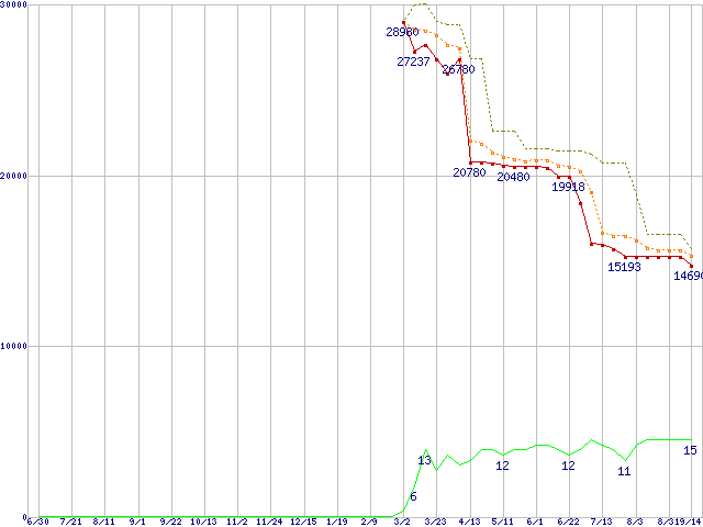 | Athlon 64 X2 5000+ (2.6GHz,L2 512KB×2,TDP65W)の価格推移 | | | (2006年6月30日~2007年9月14日) |