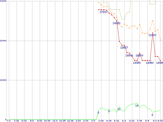 ※このグラフは過去のデータも税率5%相当に調整した税込み相当額のグラフです。 税率変更や、総額表示方式導入(2004年4月)の影響は除いています。 | | | ●凡例 | 最安値 (点線部は販売店未確認 または未調査) | 平均値 | 最高値 | ショップ数 |