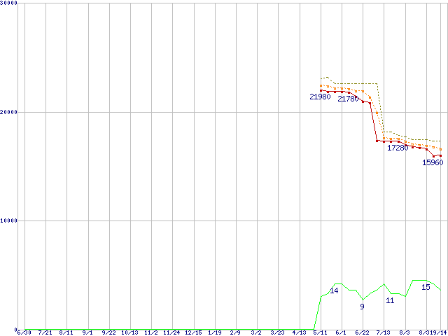| Athlon 64 X2 5200+ (2.6GHz,L2 1MB×2,TDP65W)の価格推移 | | | (2006年6月30日~2007年9月14日) |