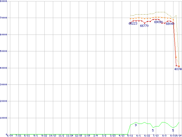| Core 2 Duo T7700 (2.4GHz,L2 4MB)の価格推移 | | | (2006年6月30日~2007年9月14日) |