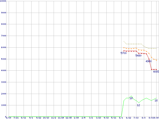 ※このグラフは過去のデータも税率5%相当に調整した税込み相当額のグラフです。 税率変更や、総額表示方式導入(2004年4月)の影響は除いています。 | | | ●凡例 | 最安値 (点線部は販売店未確認 または未調査) | 平均値 | 最高値 | ショップ数 |