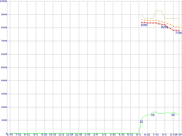 ※このグラフは過去のデータも税率5%相当に調整した税込み相当額のグラフです。 税率変更や、総額表示方式導入(2004年4月)の影響は除いています。 | | | ●凡例 | 最安値 (点線部は販売店未確認 または未調査) | 平均値 | 最高値 | ショップ数 |