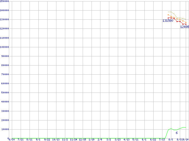※このグラフは過去のデータも税率5%相当に調整した税込み相当額のグラフです。 税率変更や、総額表示方式導入(2004年4月)の影響は除いています。 | | | ●凡例 | 最安値 (点線部は販売店未確認 または未調査) | 平均値 | 最高値 | ショップ数 |