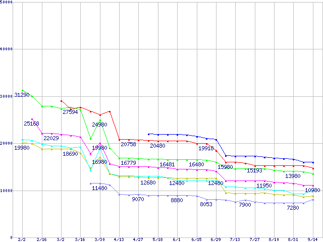 | Socket AM2 (FSB 1000MHz,Dual Core,TDP65W)の最安値推移 | | | (2007年2月2日~2007年9月14日) |