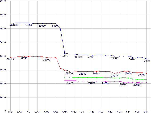 | LGA775 (FSB 1066MHz,Dual Core,EM64T対応,TDP 65W)の最安値推移 | | | (2007年2月2日~2007年9月14日) |