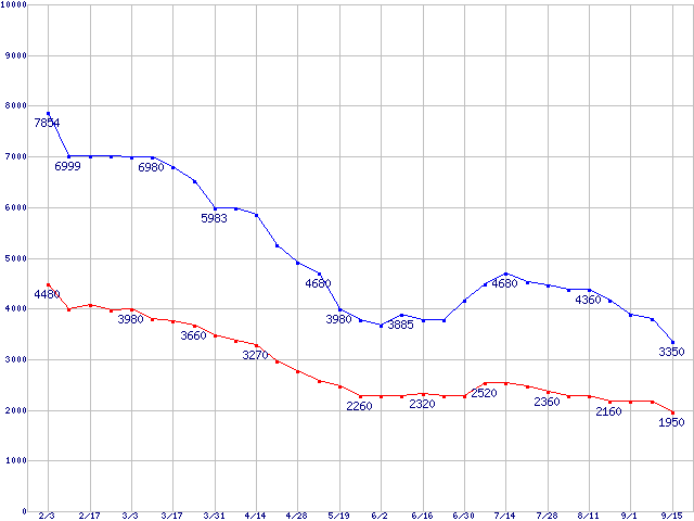 PC2-4200*(DDR2-533) DDR2 SDRAM DIMMの最安値推移