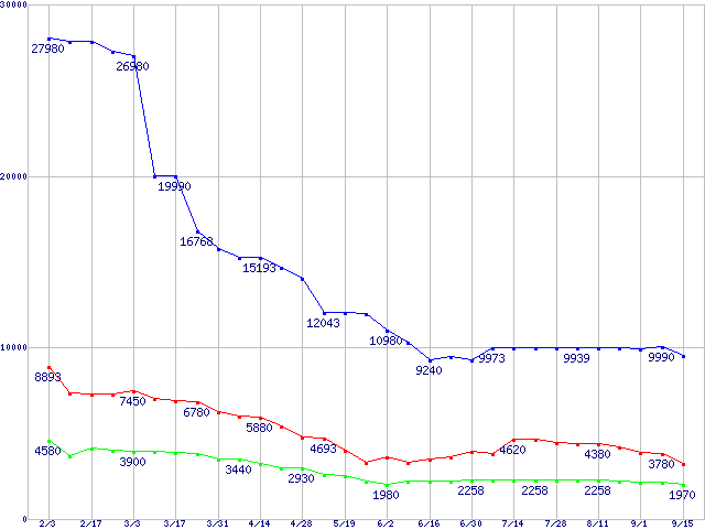 PC2-6400(DDR2-800) DDR2 SDRAM DIMMの最安値推移