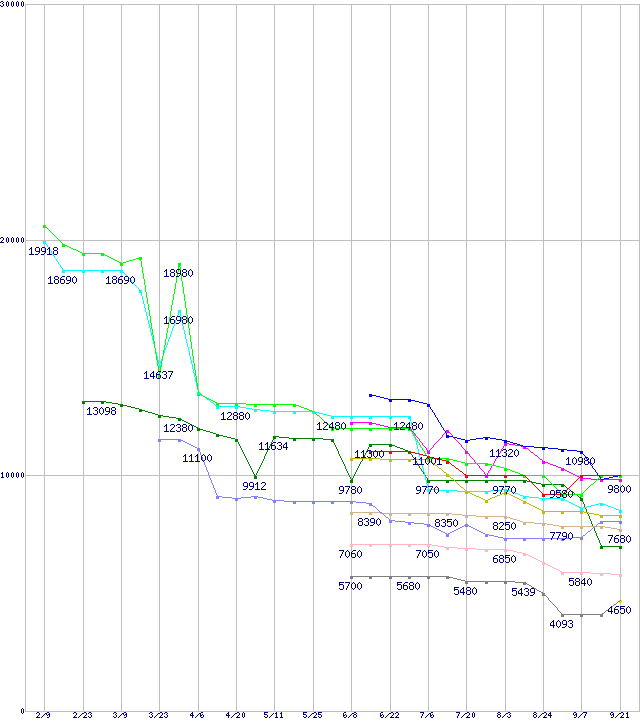 | CPU主要製品(最安値1万円未満)の最安値推移 | | | (2007年2月9日~2007年9月21日) |