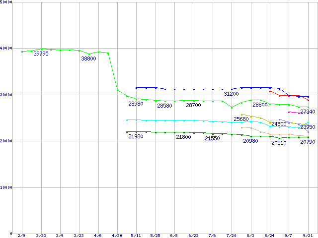 | CPU主要製品(最安値2万円~3万円未満)の最安値推移 | | | (2007年2月9日~2007年9月21日) |