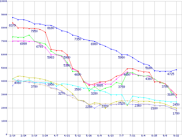 メモリ主要製品(最安値5千円~1万円未満)の最安値推移