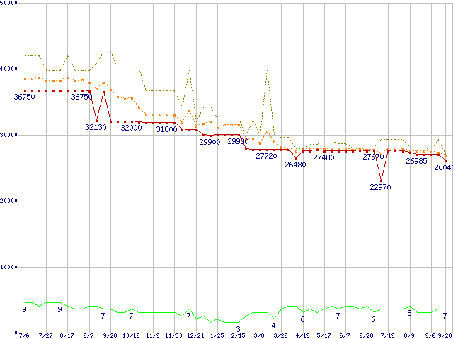 ※このグラフは過去のデータも税率5%相当に調整した税込み相当額のグラフです。 税率変更や、総額表示方式導入(2004年4月)の影響は除いています。 | | | ●凡例 | 最安値 (点線部は販売店未確認 または未調査) | 平均値 | 最高値 | ショップ数 |