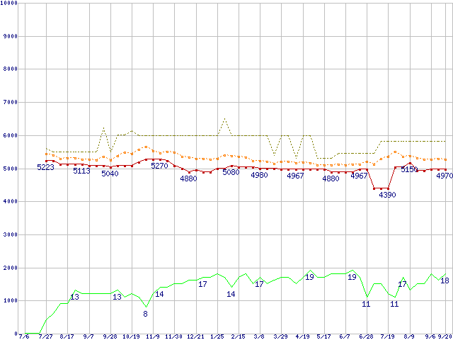 ※このグラフは過去のデータも税率5%相当に調整した税込み相当額のグラフです。 税率変更や、総額表示方式導入(2004年4月)の影響は除いています。 | | | ●凡例 | 最安値 (点線部は販売店未確認 または未調査) | 平均値 | 最高値 | ショップ数 |