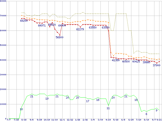| Core 2 Duo E6700 (2.66GHz,L2 4MB)の価格推移 | | | (2006年7月7日~2007年9月21日) |