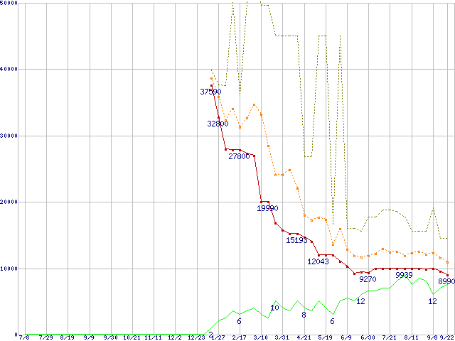 ※このグラフは過去のデータも税率5%相当に調整した税込み相当額のグラフです。 税率変更や、総額表示方式導入(2004年4月)の影響は除いています。 | | | ●凡例 | 最安値 (点線部は販売店未確認 または未調査) | 平均値 | 最高値 | ショップ数 |