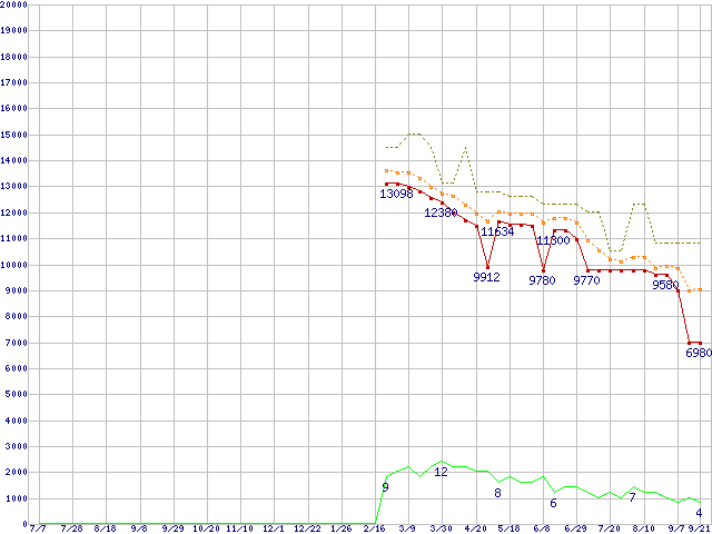 ※このグラフは過去のデータも税率5%相当に調整した税込み相当額のグラフです。 税率変更や、総額表示方式導入(2004年4月)の影響は除いています。 | | | ●凡例 | 最安値 (点線部は販売店未確認 または未調査) | 平均値 | 最高値 | ショップ数 |