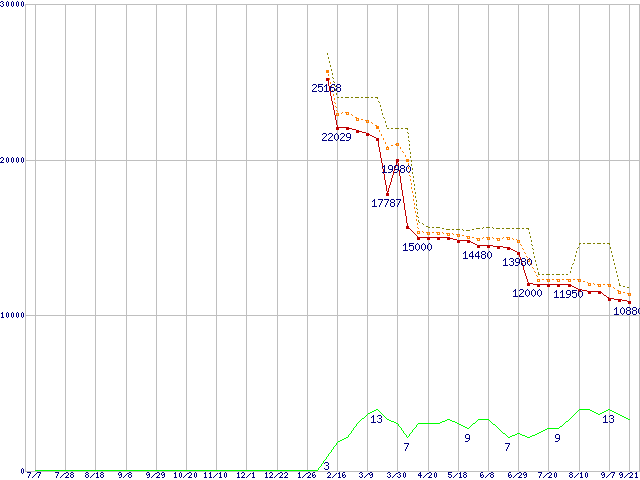 | Athlon 64 X2 4400+ (2.3GHz,L2 512KB×2,TDP65W)の価格推移 | | | (2006年7月7日~2007年9月21日) |