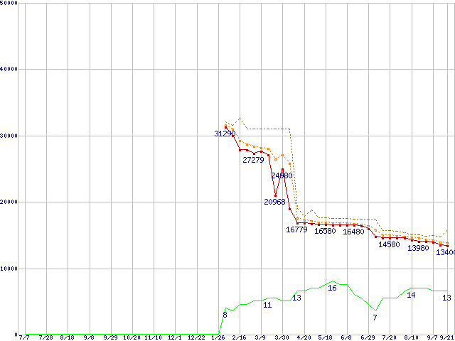 | Athlon 64 X2 4800+ (2.5GHz,L2 512KB×2,TDP65W)の価格推移 | | | (2006年7月7日~2007年9月21日) |