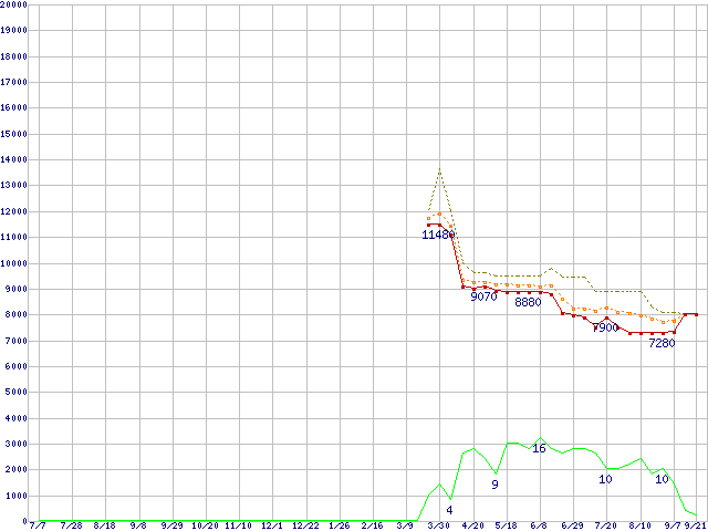 ※このグラフは過去のデータも税率5%相当に調整した税込み相当額のグラフです。 税率変更や、総額表示方式導入(2004年4月)の影響は除いています。 | | | ●凡例 | 最安値 (点線部は販売店未確認 または未調査) | 平均値 | 最高値 | ショップ数 |