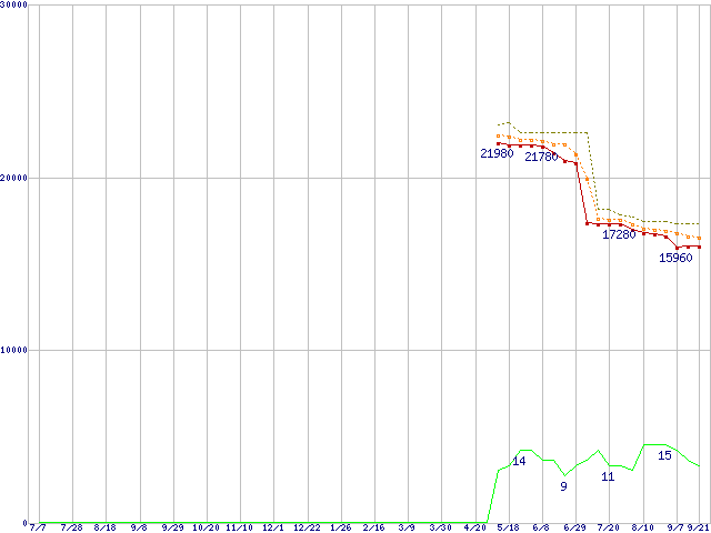 | Athlon 64 X2 5200+ (2.6GHz,L2 1MB×2,TDP65W)の価格推移 | | | (2006年7月7日~2007年9月21日) |