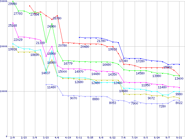 | Socket AM2 (FSB 1000MHz,Dual Core,TDP65W)の最安値推移 | | | (2007年2月9日~2007年9月21日) |
