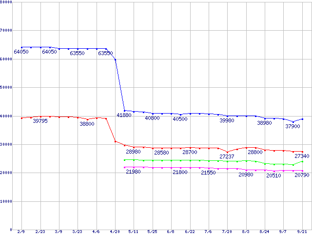 | LGA775 (FSB 1066MHz,Dual Core,EM64T対応,TDP 65W)の最安値推移 | | | (2007年2月9日~2007年9月21日) |