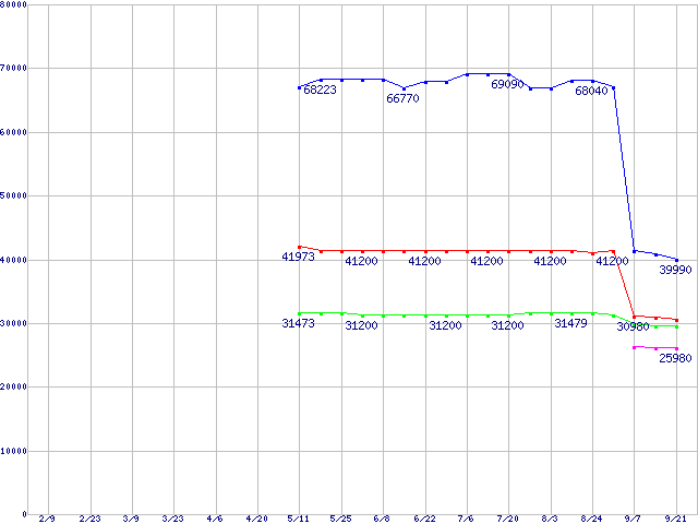 | FSB 800MHz対応Core 2 Duo向けSocket (FSB 800MHz,Dual Core,EM64T対応)の最安値推移 | | | (2007年2月9日~2007年9月21日) |