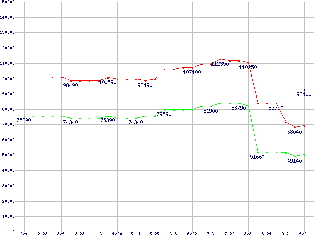 | Socket F (FSB 1000MHz,L2 1MBx2,Dual Core,TDP 95W)の最安値推移 | | | (2007年2月9日~2007年9月21日) |