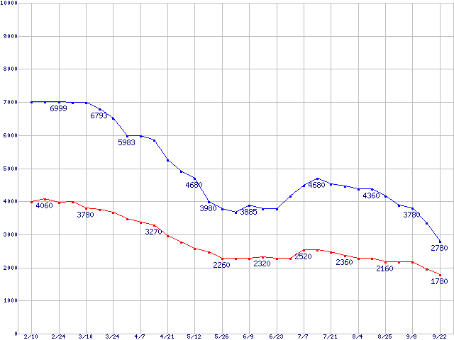 PC2-4200*(DDR2-533) DDR2 SDRAM DIMMの最安値推移