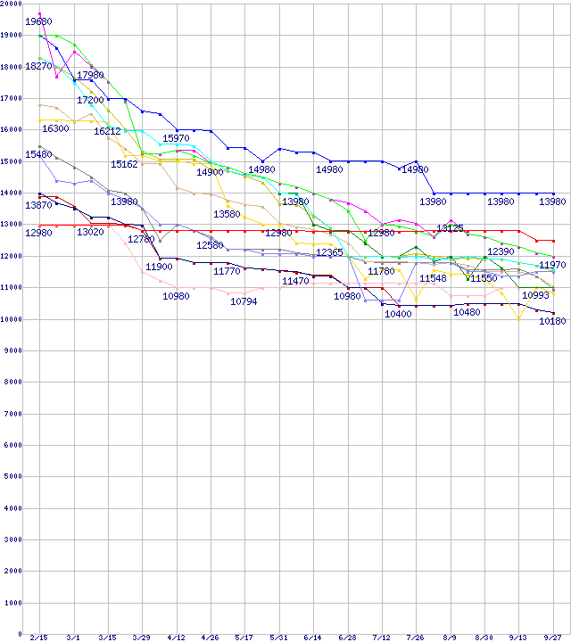 | HDD主要製品(最安値1万円~1万5千円未満)の最安値推移 | | | (2007年2月15日~2007年9月27日) |
