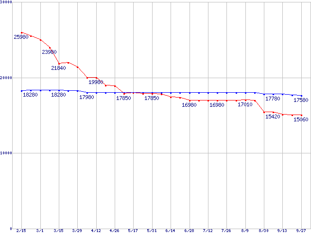 HDD主要製品(最安値1万5千円~2万円未満)の最安値推移