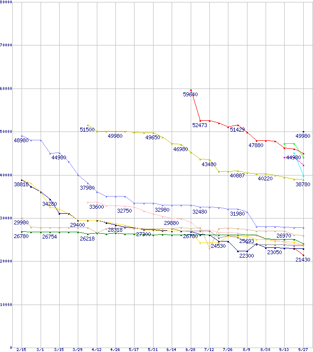 | HDD主要製品(最安値2万円以上)の最安値推移 | | | (2007年2月15日~2007年9月27日) |