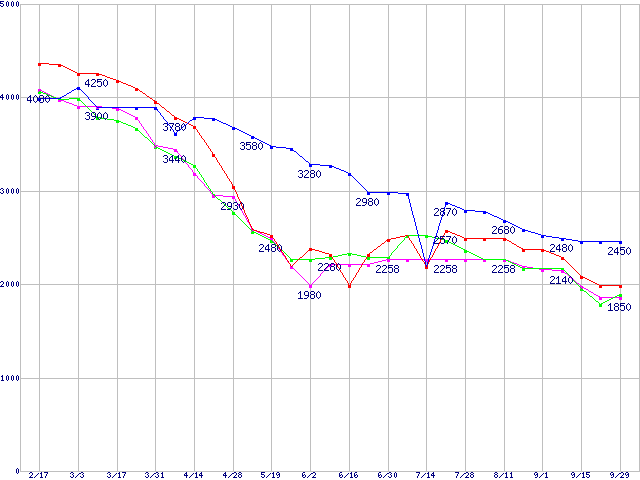 メモリ主要製品(最安値5千円未満)の最安値推移
