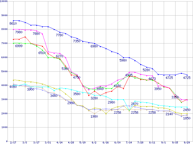 メモリ主要製品(最安値5千円~1万円未満)の最安値推移