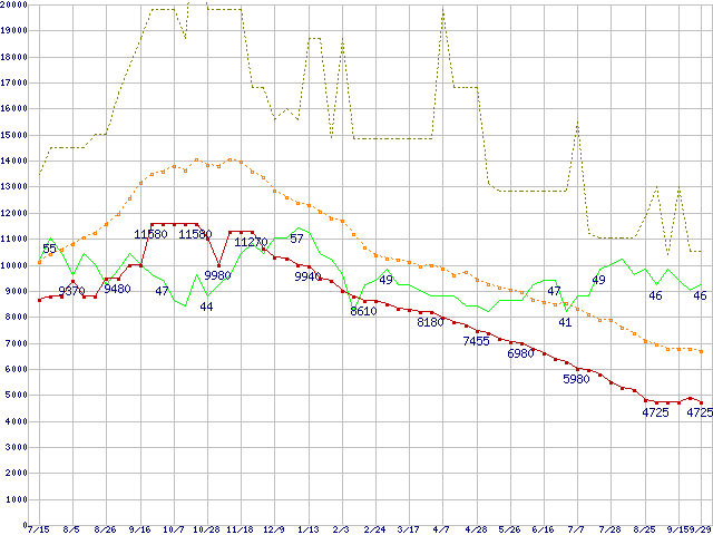 ※このグラフは過去のデータも税率5%相当に調整した税込み相当額のグラフです。 税率変更や、総額表示方式導入(2004年4月)の影響は除いています。 | | | ●凡例 | 最安値 (点線部は販売店未確認 または未調査) | 平均値 | 最高値 | ショップ数 |