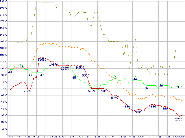※このグラフは過去のデータも税率5%相当に調整した税込み相当額のグラフです。 税率変更や、総額表示方式導入(2004年4月)の影響は除いています。 | | | ●凡例 | 最安値 (点線部は販売店未確認 または未調査) | 平均値 | 最高値 | ショップ数 |