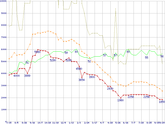 ※このグラフは過去のデータも税率5%相当に調整した税込み相当額のグラフです。 税率変更や、総額表示方式導入(2004年4月)の影響は除いています。 | | | ●凡例 | 最安値 (点線部は販売店未確認 または未調査) | 平均値 | 最高値 | ショップ数 |
