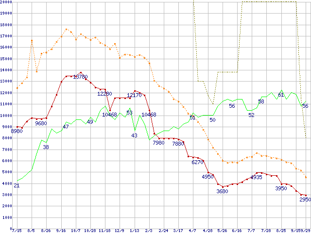 ※このグラフは過去のデータも税率5%相当に調整した税込み相当額のグラフです。 税率変更や、総額表示方式導入(2004年4月)の影響は除いています。 | | | ●凡例 | 最安値 (点線部は販売店未確認 または未調査) | 平均値 | 最高値 | ショップ数 |
