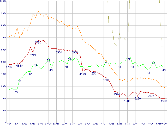 ※このグラフは過去のデータも税率5%相当に調整した税込み相当額のグラフです。 税率変更や、総額表示方式導入(2004年4月)の影響は除いています。 | | | ●凡例 | 最安値 (点線部は販売店未確認 または未調査) | 平均値 | 最高値 | ショップ数 |