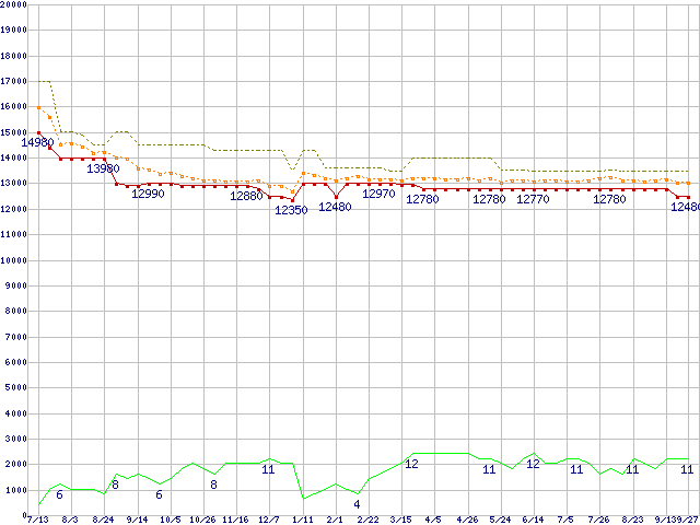 ※このグラフは過去のデータも税率5%相当に調整した税込み相当額のグラフです。 税率変更や、総額表示方式導入(2004年4月)の影響は除いています。 | | | ●凡例 | 最安値 (点線部は販売店未確認 または未調査) | 平均値 | 最高値 | ショップ数 |