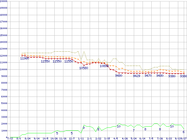 ※このグラフは過去のデータも税率5%相当に調整した税込み相当額のグラフです。 税率変更や、総額表示方式導入(2004年4月)の影響は除いています。 | | | ●凡例 | 最安値 (点線部は販売店未確認 または未調査) | 平均値 | 最高値 | ショップ数 |
