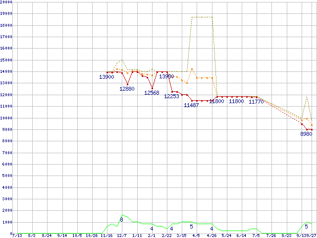 ※このグラフは過去のデータも税率5%相当に調整した税込み相当額のグラフです。 税率変更や、総額表示方式導入(2004年4月)の影響は除いています。 | | | ●凡例 | 最安値 (点線部は販売店未確認 または未調査) | 平均値 | 最高値 | ショップ数 |