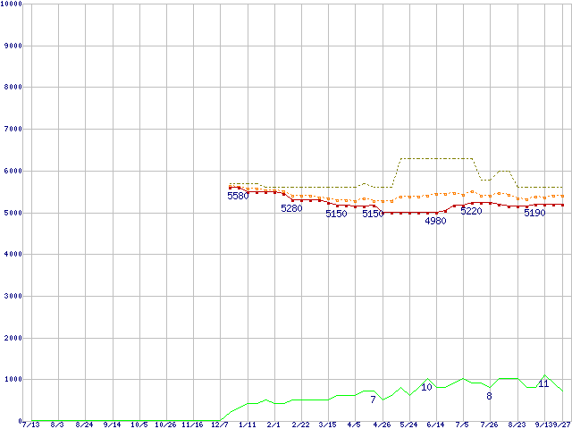 ※このグラフは過去のデータも税率5%相当に調整した税込み相当額のグラフです。 税率変更や、総額表示方式導入(2004年4月)の影響は除いています。 | | | ●凡例 | 最安値 (点線部は販売店未確認 または未調査) | 平均値 | 最高値 | ショップ数 |