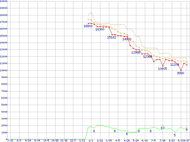 ※このグラフは過去のデータも税率5%相当に調整した税込み相当額のグラフです。 税率変更や、総額表示方式導入(2004年4月)の影響は除いています。 | | | ●凡例 | 最安値 (点線部は販売店未確認 または未調査) | 平均値 | 最高値 | ショップ数 |